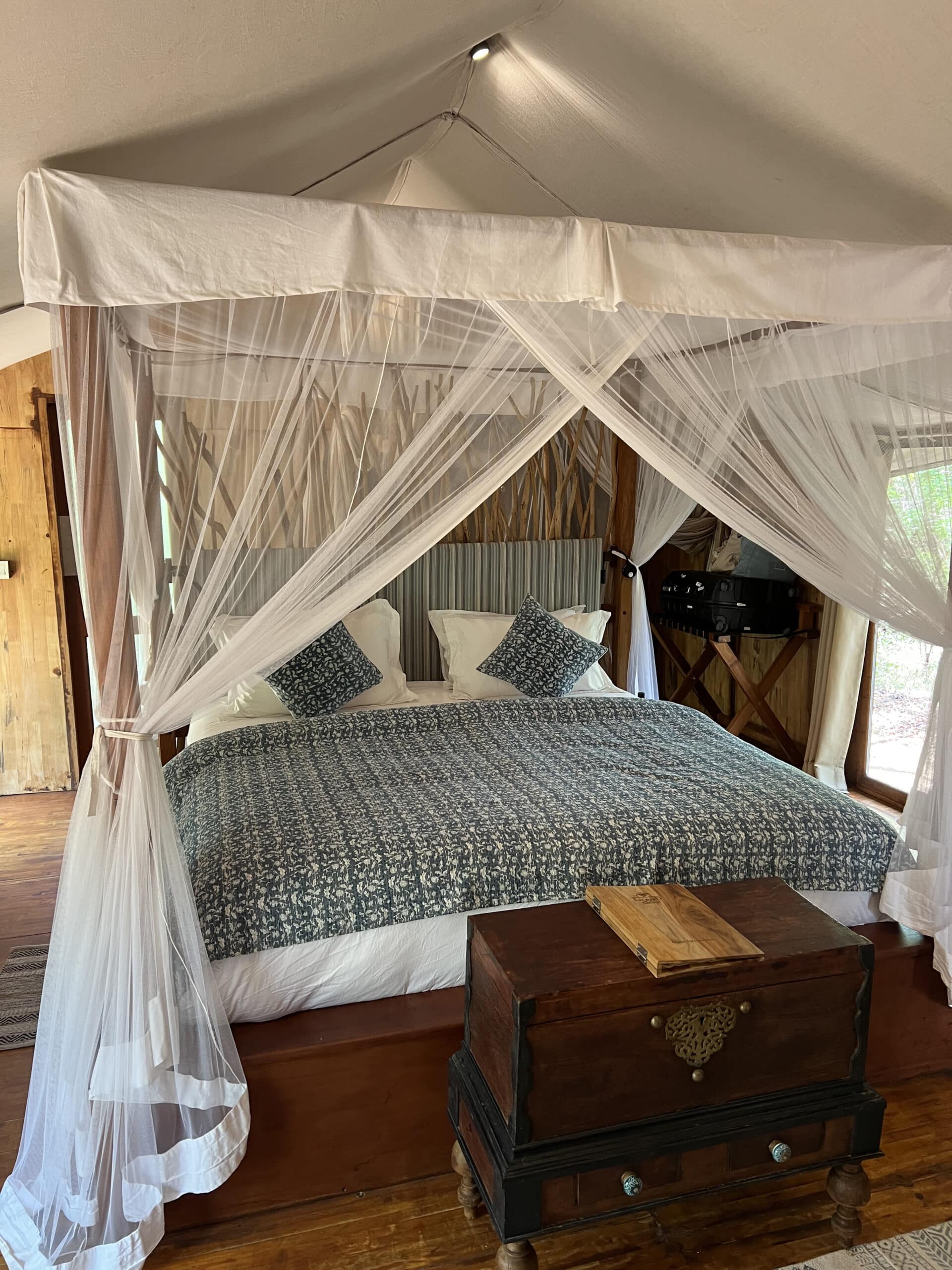 The elegant tents named after local wildlife come with very welcome air conditioning, tea and really good cafetiere, a safe, and a bathroom open to the sky for al fresco showering where the shower itself has been ‘camouflaged’ as a tree! The Family tents like ‘Hornbill’ are spacious (around 40 m²), ideal for families with a beautiful mosquito swathed four-poster king-size bed clad with the prettiest blue floral bedspread and bunk bed for the kids.