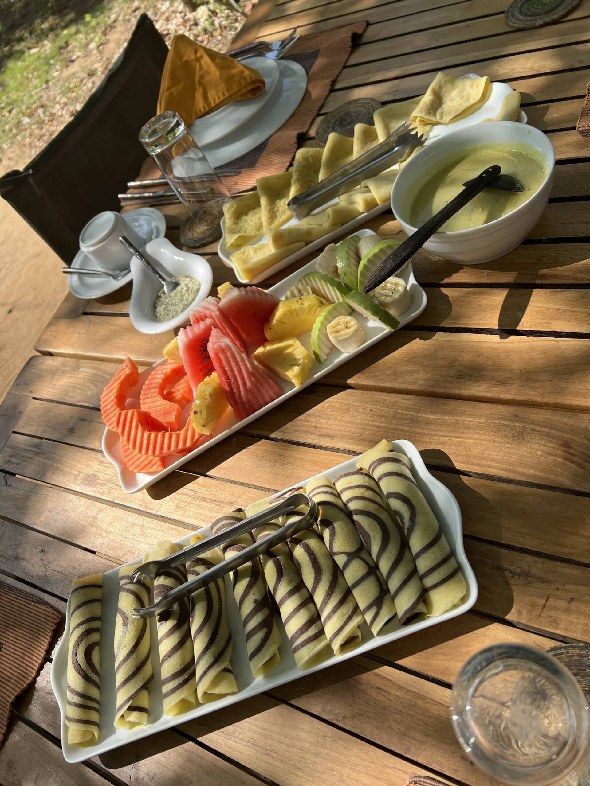 The team will make you feel ultra special by setting up tables in various locations in the shade and serving up local Sri Lankan flavours, and the odd international dish. If you can’t cope with the local spice levels, just let them know and you’ll be treated to tasty dishes like kottu rotti, shredded roti stir-fried with spices and vegetables, a savory mix that will quickly become a favorite. We also enjoy a spice-free chicken Biryani with green coconut sambo, as well as string hoppers with parippu (dhal) - a type of delicate rice noodle nests with lentil curry.  With plenty of fresh vegetables and tropical fruits, the camp’s chef uses seasonal, locally sourced ingredients, sourced from a local organic farm. You might even sample deep fried curry leaves for an aperitif and find them delicious! The vibe is relaxed yet refined, making dinnertime a highlight along with the game drives! For dessert don’t miss the rich, creamy vanilla and mango ice cream, hot bananas or baked pineapple. At breakfast, you’ll love the scrambled eggs and bacon, followed by pancakes with honey-roasted coconut - the perfect fusion experience!