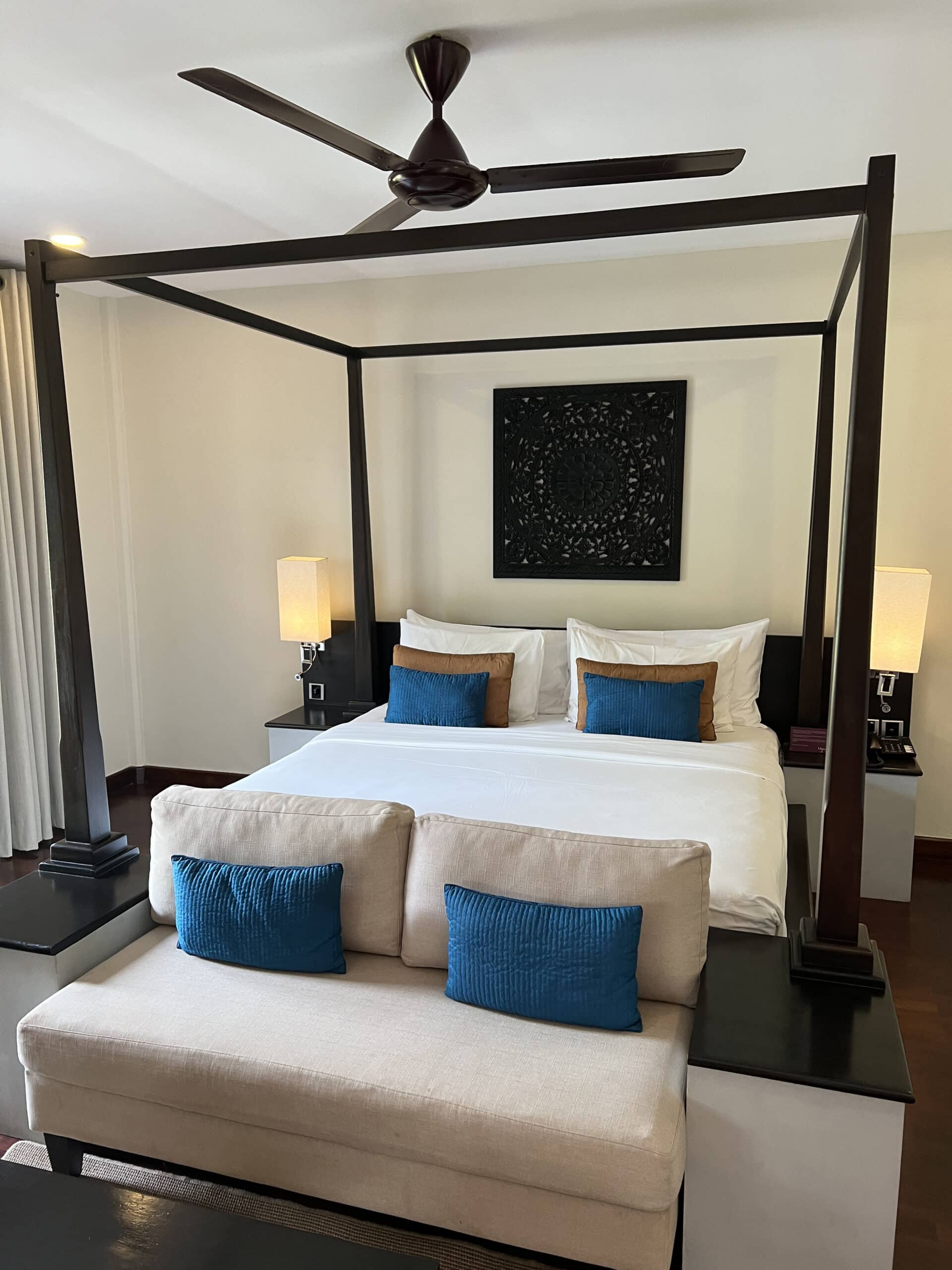 The decor oozes colonial chic, with dark exotic timbers, shiny hardwood floors, a huge four-poster bed swathed in netting, and opulent bathrooms. Everywhere,  framed antiques add to the charm with giant copper lamps and cane daybeds as well as ornaments like exotic bookends and teacaddies all adding to the look. But rest assured, there’s aircon, ipad controlled lighting and turndown service that brings sweet treats in glass jars every evening.